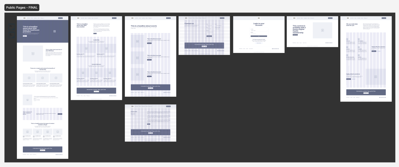 Because GDH encompasses both public and members-only content, we created a set of wireframes for each type. Templated content was extremely important, because GDH had over 20 topics for which they wanted to produce content, and our approach therefore needed to scale easily. We limited page layouts to just a few components and kept the UX very clean and straightforward, allowing the site to easily flex and grow over time.