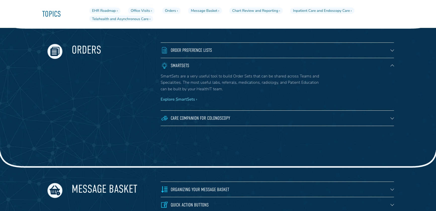 GDH wanted to organize their members-only content by topic, which was a challenge due to Epic’s complexity. Many of the platform’s feature names are proprietary (ex. SmartPhrases, SmartSets, etc.), so GDH’s users may not be familiar with these features at first. Therefore, we wanted to give users the opportunity to learn about each topic before diving into its associated resources. Rather than creating a single, filterable database of content, we opted for an index-like approach, categorizing topics using terms clinicians know, and creating on-page navigation to make browsing topics easy. We also created relationships between topics using features like related content on each page.